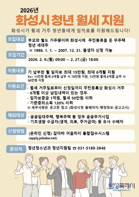 (비전21뉴스=정서영 기자) 화성특례시가 청년들의 주거비 부담을 덜고 안정적인 주거 생활을 지원하기 위해 2월 9일부터 2월 27일까지‘청년 월세 지원 사업’ 신청자를 모집한다고 밝혔다.