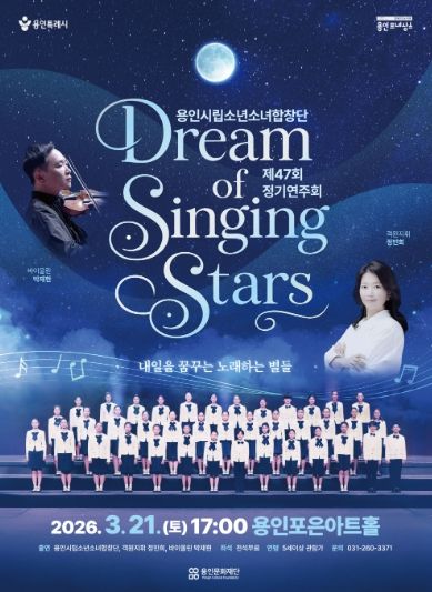 (비전21뉴스) 용인문화재단은 오는 3월 21일 용인포은아트홀에서 용인시립소년소녀합창단 제47회 정기연주회'Dream of Singing Stars'를 개최한다고 밝혔다.