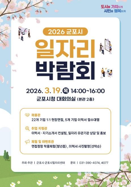 (비전21뉴스) 군포시는 오는 3월 19일 오후 2시부터 시청 대회의실에서 ‘2026년 군포시 일자리 박람회’를 개최한다. 이번 박람회는 지역 내 우수 기업과 구직자가 직접 만나는 채용의 장으로 제조, 서비스, 물류배송, 의료복지 등 다양한 분야에서 폭넓은 취업 기회를 제공할 예정이다.
