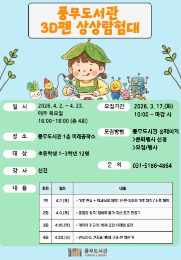 3월 17일 오전 10시부터 풍무도서관 홈페이지에서 참여 신청할 수 있으며, 초등학생 1~3학년 12명을 선착순으로 모집한다.