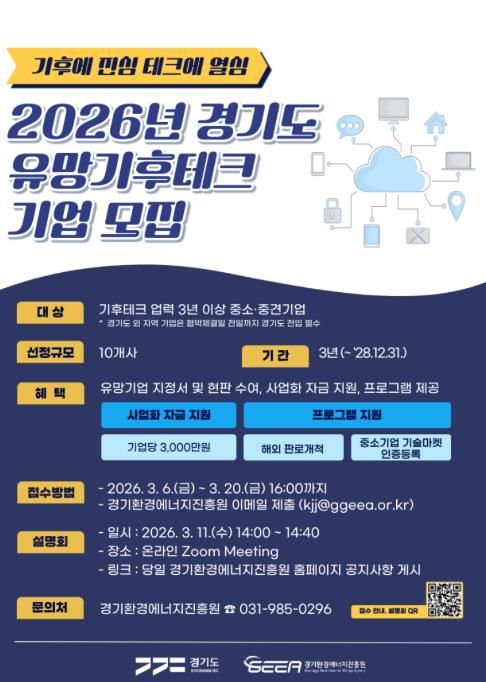 (비전21뉴스) 경기도와 경기환경에너지진흥원이 기후위기 대응을 선도할 혁신 기술 보유 기업을 발굴하기 위해 오는 3월 20일까지 ‘2026년 경기도 유망 기후테크 기업’ 10곳을 모집한다.