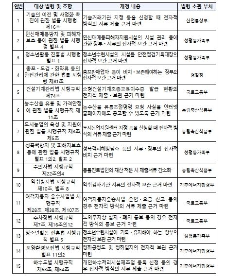그동안 '민원 처리에 관한 법률' 등에 따라 전자적 방식으로 각종 서류를 제출ㆍ보관할 수 있음에도, 국민들이 이러한 규정을 알지 못해 서류를 실물로 제출ㆍ보관하는 경우가 있었다. 이와 같은 국민 불편을 해소하기 위해 서류의 제출ㆍ보관 의무를 규정하고 있는 '기술의 이전 및 사업화 촉진에 관한 법률 시행령' 등 4개 대통령령에 직접 전자적 방법으로 서류를 제출ㆍ보관할 수 있도록 하는 근거를 마련했고, '건설기계관리법 시행규칙' 등 11개 부령에도 동일한 근거를 마련하여 3월 24일 공포될 예정이다.