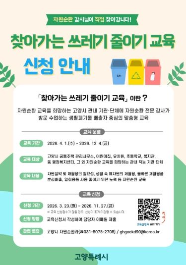 (비전21뉴스) 고양특례시는 생활 속 자원순환 실천을 유도하기 위해 오는 4월부터 12월까지 9개월간 ‘2026년 찾아가는 쓰레기 줄이기 교육’을 운영한다.