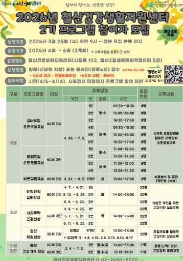 (비전21뉴스) 광명시 보건소 철산건강생활지원센터가 ‘2026년 건강생활 프로그램 2기’ 참가자를 오는 25일 오전 9시부터 선착순 모집한다.