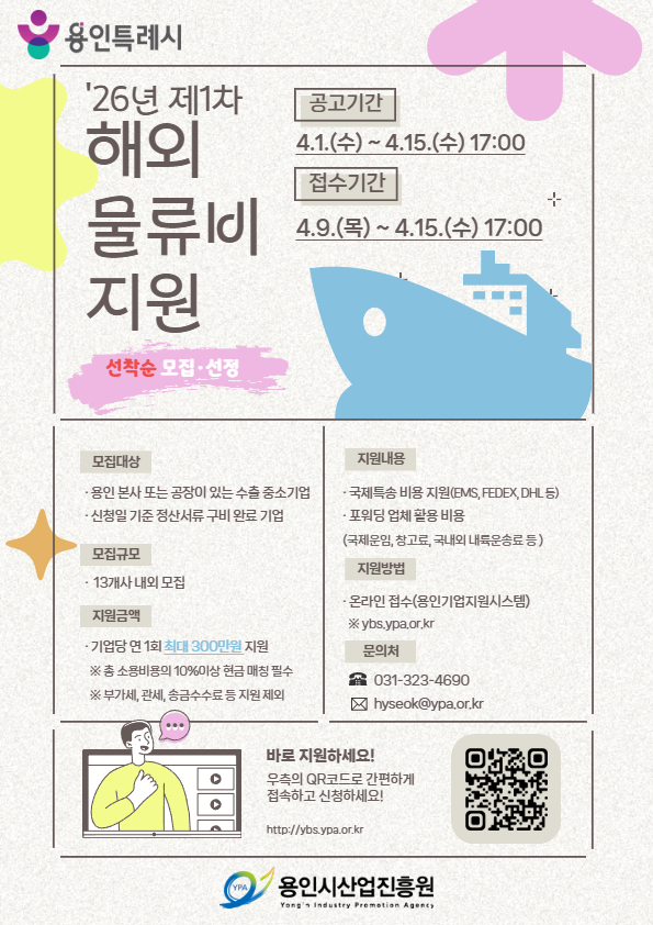 이번 사업은 중동지역 분쟁 확산과 환율 상승으로 해상·항공 운임 부담이 급증하는 상황에 대응해, 용인시 소재 수출 중소기업의 물류비 부담을 완화하고 수출 경쟁력을 유지·강화하기 위해 마련됐다. 진흥원은 신속한 지원을 통해 기업 현장의 애로를 조기에 해소한다는 방침이다.