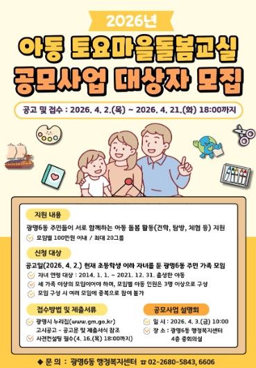 (비전21뉴스) 광명시 광명6동 행정복지센터는 오는 21일까지 ‘2026년 아동 토요마을돌봄교실 공모사업’에 참여할 주민 가족 모임 20개 팀을 모집한다.