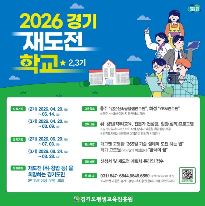 (비전21뉴스) 경기도와 경기도평생교육진흥원은 취업이나 창업 실패를 경험한 도민의 재기를 지원하기 위해 오는 20일부터 ‘2026년 경기 재도전학교’ 2~3기 참가자를 각각 55명 내외로 모집한다.