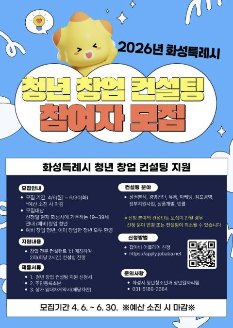 (비전21뉴스) 화성특례시는 오는 6월 30일까지 ‘2026년 청년 창업 컨설팅 지원사업’ 참여자를 모집한다.