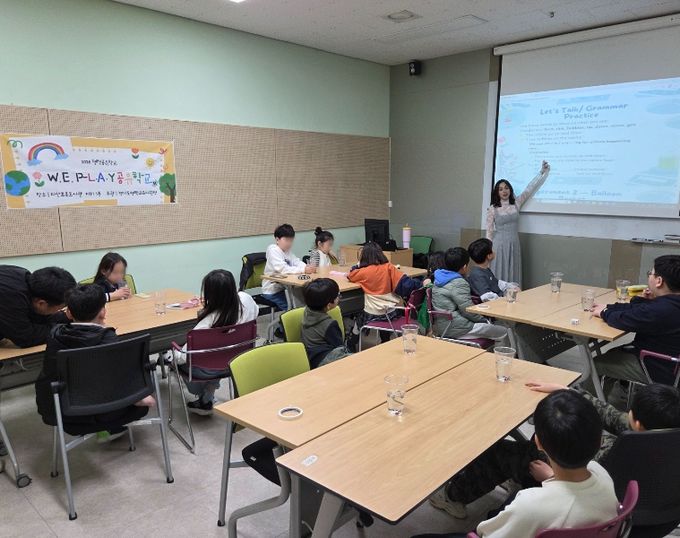 ‘W.E. P-LAY학교(Wake up! English!)’는 영어 회화 능력 향상 및 문화교류를 목적으로 기획된 체험형 프로그램으로, 미공군 가족 자원봉사자와 함께하는 활동 중심 수업으로 구성됐다.