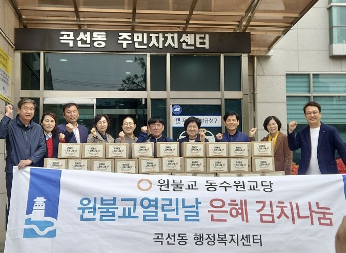 (비전21뉴스) 원불교 동수원교당은 지난 22일 수원시 권선구 곡선동 행정복지센터에서 봄맞이 ‘은혜김치 나눔’ 전달 행사를 개최하고, 정성껏 담근 김치 30박스를 곡선동에 전달했다.