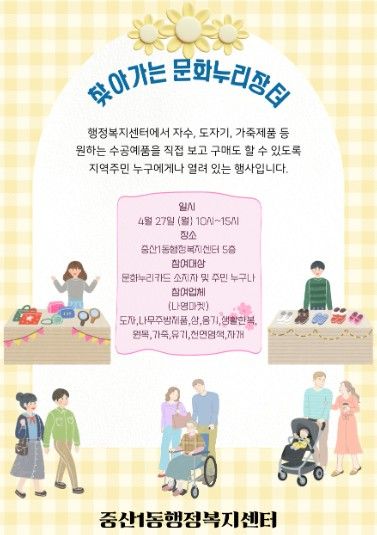 (비전21뉴스) 고양특례시 일산동구 중산1동은 오는 4월 27일 오전 10시부터 오후 3시까지 센터 5층 다목적실에서 ‘찾아가는 문화누리장터’를 개최한다.
