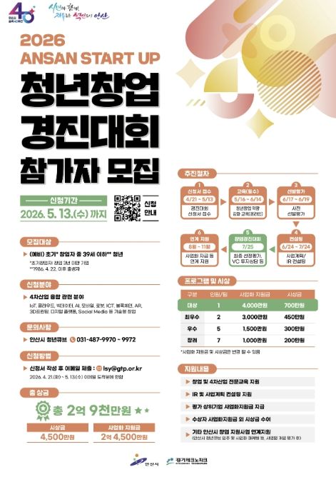 (비전21뉴스) 안산시는 창의적인 아이디어를 보유한 청년 창업가를 발굴하기 위해 내달 13일까지 ‘2026 안산 스타트업 청년창업 경진대회’ 참가자를 모집한다고 24일 밝혔다.