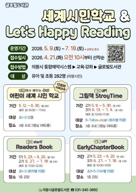 (비전21뉴스) 의왕시 글로벌도서관이 책을 통해 세상을 이해하고 체험하는 다문화 이해 프로그램 '어린이 세계 시민 학교'와 영어 읽기 문해력 향상을 위한 단계별 맞춤 프로그램 'Let’s Happy Reading'의 참여자를 모집한다.