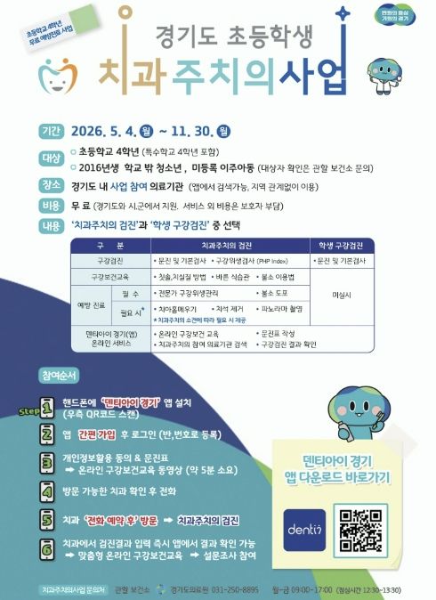초등학생 치과주치의사업은 예방 중심의 포괄적 구강건강관리 서비스를 제공해 아동의 올바른 구강관리 습관 형성을 돕고, 영구치 우식률을 낮춰 향후 치과 치료비 부담을 줄이기 위해 시행한다. 포천시는 대상 아동 1인당 4만 8천 원의 검진비를 지원한다.
