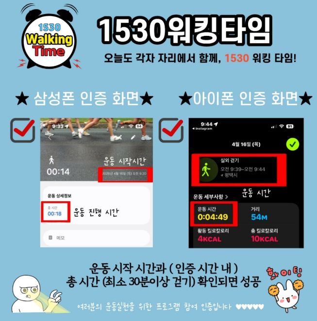 프로그램은 4월 27일부터 5월 22일까지 4주간 진행되며, 참여자는 카카오톡 오픈채팅방에 입장해 운동 전 ‘미션 사진’을 인증하고, 30분 이상 걷기 후에는 걷기 앱 활동 내역을 캡처해 제출하는 방식으로 참여한다.