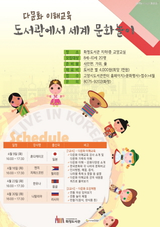 이번 행사는 고양시도서관센터와 다문화가족지원센터가 연계해 국내로 이주한 일본, 필리핀, 몽골, 러시아 외국인 강사를 활용해 다양한 문화를 접하고, 어린이들이 보다 쉽게 상호문화를 이해하고 어울릴 수 있도록 체험학습도 병행한다. 오는 26일부터 접수를 받아 4월 9일부터 4월 30일까지 매주 화요일마다 화정도서관 교양교실에서 프로그램을 운영할 계획이다.