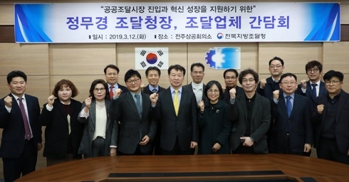 [비전21뉴스] 정무경 조달청장은 12일 전주시 완산구 전주 상공회의소에서 창업·벤처기업, 우수조달기업 등 13개 사를 초청, 기술력 있는 창업·벤처기업들의 공공조달시장 진입을 통해 혁신성장 할 수 있는 방안 등을 논의하기 위한 간담회를 가졌다.