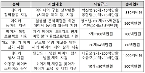 메이커 문화 확산사업은 메이커 운동에 대한 국민적 관심과 참여를 확대하기 위해 창의적 아이디어를 직접 구현하는 다양한 메이커 활동을 발굴·지원하는 것으로,
