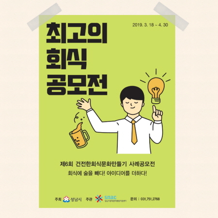 과도한 음주로 인한 폐해를 예방하고, 술을 대신할 수 있는 다양한 회식 방법을 직장인에게 제시하기 위해 성남시 중독관리통합지원센터가 주관해 열리는 공모다.