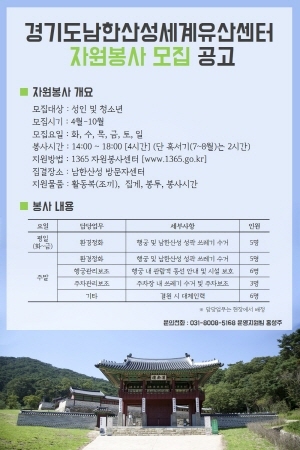 [비전21뉴스] 경기도남한산성세계유산센터가 세계유산 남한산성 보호 등을 위해 오는 4월 2일부터 10월 31일까지 자원봉사자를 모집한다.