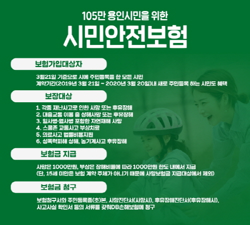 [비전21뉴스] 용인시는 지난해에 이어 올해도 모든 시민이 일상생활에서 예상치 못한 재난이나 사고를 당했을 때 보험 혜택을 받을 수 있도록 ‘시민안전보험’을 시행한다고 1일 밝혔다.