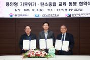 (비전21뉴스) 용인특례시는 8일 시청 접견실에서 강남대학교, 용인예술과학대학교와 ‘용인형 기후위기·탄소중립 교육 동행 협약’을 체결했다. 이날 협약식은 기후위기에 공동으로 대응하고, 지속가능한 지역사회 발전과 미래 세대 양성을 위해 마련됐다. 협약의 주요 내용은 ▲탄소중립‧기후 위기 대응 교육프로그램 공동 개발‧운영 ▲교육봉사‧멘토링 등 교원‧전문가‧학생 간 교류와 연계 활동 지원 ▲지역사회 대상 탄소중립 홍보‧캠페인‧체험 교육 공동 추진 ▲교육시설‧인프라 상호 활용 등이다. 협약에 따라 시와 두 대학은 탄소중립 사회 실현을 위한 교육 모델을 구축한다는 방침이다. 각 대학의 유아교육과 인력과 연계해 교육봉사 기회를 확대하고, 신규 프로그램을 공동 개발해 용인지역 학생들을 탄소중립 실천 의지를 가진 인재로 육성하고, 시민의 환경 감수성을 높이는 데도 이바지하겠다는 계획이다. 이에 따라 오는 12일 용인예술과학대 유아교육과 연극동아리가 기후변화체험교육센터에서 아동 30명을 대상으로 관련 연극을 진행한다. 이상일 시장은 “기후 위기는 글로벌 차원의 가장 중대한 문제인 만큼 기후