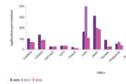 심사관 당 출원건수 변화 추이 [비전21]특허청은 세계지식재산권기구(WIPO)가 발간한 '세계지식재산지표(World Intellectual Property Indicator) 2017'에 의하면 GDP 및 인구 대비 특허출원건수에서 우리나라가 지난 2016년에도 1위를 차지한 것으로 나타났다고 밝혔다. '세계지식재산지표 2017'은 WIPO 회원국의 특허, 상표, 디자인 등 지식재산권에 관한 지난 2016년 각종 통계수치와 변화추이를 수록한 통계보고서이다. 이 보고서에 따르면, 지난 2016년 전세계 특허출원은 처음으로 300만건을 넘어선 312.8만건으로 2015년(288.9만건)에 비해 8.3% 증가했고, 나라별로는 중국이 1위(134만건)를 차지하고 있으며, 미국(60.6만건), 일본(31.8만건), 우리나라(20.9만건)가 그 뒤를 따르는 것으로 나타났다. 그러나, GDP 대비 출원건수와 인구 대비 출원건수에서는 미국·일본·독일 등 주요 선진국을 크게 앞선 1위를 유지하고 있어, 우리나라가 특허출원 강국임을 보여주고 있다. 이번 보고서에서는 특별히 각 국의 특허심사 동향 및 연도별 변화추이에 대한 분석자료를 수록하고 있는 점이 눈에 띈다.