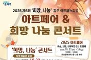 (비전21뉴스) 파주시가 주최하고 ㈔한국예술문화단체총연합회 파주지회에서 주관하는 '2025 제6회 ‘희망, 나눔’ 파주 아트페스티벌'이 10월 22일부터 24일까지 3일간 운정행복센터에서 개최된다. 올해로 6회를 맞이한 이번 축제는 다양한 분야의 예술을 매개로 온정을 나누고 희망과 행복을 전하기 위해 마련됐으며, 축제를 통해 발생한 수익금은 어려운 이웃에게 전달되고 있다. 축제 기간 동안 운정행복센터에 파주예총 전문 예술인들의 미술, 사진, 시화 작품 등을 전시하고 판매하는 공간이 운영되며, 23일과 24일에는 지역 예술인 및 초청 가수(전원석, 이규석, 녹색지대)들의 공연 ‘희망, 나눔 콘서트’가 개최된다. 공연 시작 전에는 무료로 가족사진 찍어주기 행사가 진행될 예정이다. 유초자 문화예술과장은 “이번 축제가 어려운 환경에 있는 이웃에게 나눔을 전하는 계기가 되기를 소망한다”라며, “일상 속에서 예술을 가까이 만날 수 있는 이번 축제에 시민 여러분의 많은 관심과 참여를 바란다”라고 말했다.