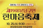 (비전21뉴스) ‘제19회 분당구민 한마음 축제’가 오는 10월 25일 오전 9시 30분~오후 1시 중앙공원 야외공연장에서 열린다. 성남시 분당구가 후원하고 분당구민 한마음 축제 추진위원회(위원장 김성민)가 주최해 열리는 이번 행사는 지역사회 화합 분위기를 조성하고자 ‘함께 여는 미래, 함께 만드는 분당’을 주제로 진행된다. 이날 성남시립합창단과 시민 예술단 아인스바움의 공연으로 축제의 화려한 막을 연다. 이어 수내3동, 정자3동, 야탑1동, 백현동 주민자치센터 문화 프로그램에 참여 중인 4개 팀이 난타, 한국무용, 줌바, 에어로빅 등 흥겨운 공연으로 중앙무대를 꾸민다. 초청 가수 김용필(미스터트롯2 출신)의 ‘오히려 좋아’, ‘낭만의 계절’, 바이올리니스트 백진주와 소프라노 유경진이 듀엣으로 연주하는 영화음악(OST) ‘캐리비안의 해적’, ‘대부’, 성남청년프로예술단의 댄스 공연도 열려 축제 분위기를 달군다. 중앙공원 황새울광장에는 배틀 로봇, 4족 보행 로봇 등 6개의 4차산업 체험존, 시민 체험용 드론 축구존, 추억의 사진관을 차려 운영한다. 장애인 복합사업장인 굿윌스토어 물품을
