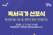 (비전21뉴스) 파주시는 오는 11일 15시, 파주출판도시 지혜의숲 대회의실에서 ‘파주시 독서국가 선포식’을 개최하고 책 읽는 도시를 넘어 ‘독서국가’로 나아가기 위한 힘찬 출발을 알린다. 이번 선포식은 지난 1월 국회의원관에서 열린 ‘독서국가 선포식 및 독서국가 추진위원회 출범식’의 취지에 발맞춰, 인공지능(AI) 시대에 대응하는 독서교육의 국가적 전환 움직임에 동참하고, 책과 도서관의 도시이자 출판산업의 중심지라는 도시의 강점을 바탕으로 시민과 함께하는 독서 생태계를 확대하기 위해 마련됐다. 이날 행사에는 도서관·교육·출판·서점 관계자와 시민 등 200여 명이 참석할 예정이며, ▲독서국가 선언문 발표 ▲대형 붓글씨 시연 ▲문단계의 아이돌이자 국회 독서국가 추진위원회 공동위원장인 박준 작가의 ‘읽는 하루’강연을 펼칠 예정이다. 파주시는 이번 선포식을 계기로 독서문화 확산 정책을 더욱 체계화해 시민 일상 속에 책 읽는 문화를 더욱 깊이 뿌리내리게 할 계획이다. 이번 행사는 시민 누구나 참여할 수 있으며, 참가 신청은 파주시도서관 누리집 또는 홍보물 내 정보 무늬(QR코드)를 이용하면 되고, 문의사항
