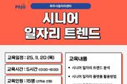 (비전21뉴스) 파주시는 10월 17일부터 11월 12일까지 ‘시니어 일자리 트렌드’ 교육에 참여할 교육생 15명을 모집한다. 이번 교육은 노년층의 취업률 향상을 위한 프로그램으로, 파주시에 거주하는 60세 이상 구직자를 대상으로 진행된다. 교육 과정은 ▲노인 일자리 동향 ▲일자리 유형별 특징 ▲참여 절차 및 취업 연계 방안 등이며, 노년층이 실제 일자리에 참여하는 데 필요한 정보를 습득할 수 있도록 구성됐다. 교육 신청은 파주시 일자리센터 또는 문산·운정행복센터 내 일자리 상담 창구 방문 또는 온라인(구글 서식)을 통해 할 수 있다. 이이구 민생경제과장은 “최근 노인 일자리는 인구 고령화에 따라 다양화되고 전문화되는 추세”라며 “이번 교육을 통해 어르신들이 자신의 경험과 역량을 살려 적성에 맞는 일자리를 찾고, 보다 활기찬 노후를 설계하기를 바란다”라고 말했다.