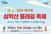 (비전21뉴스) 파주시 교하동 주민자치회는 오는 25일 10시, 심학초등학교에서 ‘2025년 제10회 심학산 둘레길 축제’를 개최한다고 밝혔다. ‘깊어가는 가을 속 심학산으로 초대합니다’를 주제로 열리는 이번 행사는 가족이 함께 걷고 즐기는 가을맞이 지역 축제로, 심학산의 아름다운 둘레길을 배경으로 다양한 프로그램이 진행될 예정이다. 이날 축제는 오전 10시 식전 공연을 시작으로, 11시 개막식이 진행된다. 축제 현장에는 체험공간, 먹거리 장터, 농산물 직거래 장터, 풍자화(캐리커처) 무료 체험(선착순 30명) 등 풍성한 볼거리와 즐길 거리가 마련된다. 또한 경품 추첨과 노래자랑 등 참여형 행사도 진행되며, 75인치 발광다이오드(LED) 텔레비전 등 푸짐한 경품이 준비돼 있다. 특히 올해 축제에는 파주시 홍보대사이자 초대가수 김대훈이 출연해 신나는 무대를 선보일 예정이다. 박용호 교하동 주민자치회장은 “올해로 10회를 맞은 심학산 둘레길 축제는 주민이 주도하는 교하동의 대표 축제로 자리 잡았다”라며 “마을회관에서 행사장까지 차량 지원을 제공하는 등 많은 주민들이 불편 없이 참여할 수 있도록 철저히