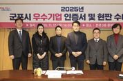 (비전21뉴스) 군포시는 17일 시청 3층 중회의실에서 ‘2025년 군포시 우수기업 인증서 및 현판 수여식’을 열고 5개 우수기업에 인증서와 현판을 수여했다. ‘우수기업 선정사업’은 2022년부터 시작하여 올해 4번째로 추진하는 사업으로 일자리 창출, 세수 증대 등 지역경제 활성화에 기여한 기업을 선정하여 인센티브를 부여하는 사업이다. 선정된 우수기업은 인증기간(3년) 동안 군포시 중소기업 육성자금 지원 시 추가 이차보전, 군포시 관내 공영주차장 이용 시 주차요금 감면, 협약병원 의료비 지원 등의 인센티브가 부여된다. 하은호 군포시장은 “어려운 경제 상황 속 관내 우수한 기업에 활력을 불어넣기 위한 우수기업 선정사업에 관심 가져주심에 감사드리며, 앞으로도 기업지원 사업을 다각화하여 기업 경영하기 좋은 환경을 만들겠다”고 말했다. 올해 선정된 군포시 우수기업은 △(주)아이씨에이치 △㈜지비티코리아 △주식회사예선테크 △듀라텍 주식회사 △㈜트리플닷 으로 총 5개 기업이다.