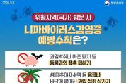 (비전21뉴스) 오산시는 질병관리청이 지난 9월 8일 니파바이러스감염증을 제1급감염병으로 신규 지정함에 따라 시민들에게 감염예방수칙 준수와 개인위생 관리에 철저를 기해줄 것을 당부했다. 니파바이러스감염증은 현재 국내 유입 가능성은 낮지만, 인체 감염 시 치명률이 40~75%에 달하는 것으로 알려져 있어 철저한 관리가 필요한 신종감염병이다. 니파바이러스는 사람과 동물 모두에 감염될 수 있으며, 감염된 동물(과일박쥐, 돼지 등)과의 접촉이나 오염된 식품(대추야자수액 등) 섭취를 통해 전파될 수 있다. 또한 환자의 체액과 밀접 접촉 시 사람 간 전파도 가능하다. 특히 최근 환자 발생이 지속되고 있는 검역관리지역인 인도와 방글라데시를 방문한 여행객은 귀국 후 14일 이내에 발열, 두통, 인후통 등 의심 증상이 나타날 경우 질병관리청 콜센터 또는 관할 보건소로 즉시 신고해야 한다. 예방을 위해서는 ▲야생동물과의 접촉 피하기 ▲오염된 음료·식품 섭취 금지 ▲환자와 직접 접촉 피하기 ▲손 씻기 등 개인위생 관리 철저가 필요하다. 김태숙 오산시보건소장은 “코로나19 경험을 통해 신종감염병에 대한 선제