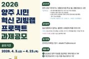 (비전21뉴스) 양주시가 시민이 일상에서 겪는 사회문제를 직접 발굴하고 해결 방안을 모색하는 ‘2026년 양주 시민 혁신 리빙랩 프로젝트’ 공모를 오는 23일까지 진행한다. 이번 공모는 시민 참여를 기반으로 지역사회 문제 해결 방안을 도출하기 위해 마련됐다. 양주시에 거주하거나 직장·학교 등 생활권을 둔 시민이면 누구나 참여할 수 있다. 참여는 주제안자를 포함한 4인 이상으로 구성된 팀 단위로 가능하며, 공감토크(현장심사)와 과제 선정 이후 진행되는 워크숍, 성과공유회(12월 예정) 등에 참여해야 한다. 공모 주제는 청소년·청년, 탄소중립, 도시재생, 1인 가구, 반려동물 문화, 디지털 격차 등 지역사회가 직면한 다양한 사회문제 해결과 관련된 아이디어다. 접수된 제안은 사회적 가치와 효과성·창의성, 실현 가능성 등을 기준으로 제안심사실무위원회 심사와 공감토크 현장심사를 거쳐 최종 과제로 선정된다. 최종 선정된 2개 팀은 5월부터 11월까지 약 7개월간 퍼실리테이터(활동촉진자)와 함께 워크숍에 참여하며, 문제 정의부터 개선 방향 도출, 시범사업 추진까지 단계별 프로젝트를 수행하게 된다.