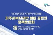 (비전21뉴스) 파주시는 오는 29일 14시, 교하도서관 3층 소극장에서 ‘파주시복지재단 설립 공론화 정책토론회’를 개최한다고 밝혔다. 이번 토론회는 파주시복지재단 설립을 앞두고 시민, 전문가, 현장 종사자의 다양한 의견을 수렴해 재단 설립의 필요성과 발전 방향을 함께 모색하기 위해 마련됐다. 토론회는 김민철 서영대학교 사회복지행정학과 교수의 기조 강연을 시작으로, 파주시 복지기획팀장의 주제 발표가 이어진다. 이어 한지원 두원공과대학교 교수가 좌장을 맡아 토론을 진행하며, 이보경 파주시문산종합사회복지관 관장, 오민수 경기복지재단 선임연구위원, 박윤근 화성시복지재단 사업본부장 등이 참석해 열띤 논의를 펼칠 예정이다. 토론에서는 ▲파주시복지재단 설립의 필요성과 추진 개요 ▲파주시 여건을 반영한 복지재단의 발전 방향 ▲재정 자립 및 지속가능성 확보 방안 등 다양한 주제가 심도 있게 논의될 예정이다. 김은숙 복지정책국장은 “파주시복지재단은 시민의 삶을 보다 세밀하게 지원하고, 지역 현장의 목소리를 반영한 ‘파주형 복지모델’을 실행할 구심점이 될 것”이라며, “이번 토론회를 통해 파주시 복지 정책의 새로운