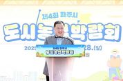 (비전21뉴스) 파주시는 운정건강공원에서 지난 26일부터 3일간 ‘젊은 농부와 도시가 만나다’를 주제로 열린 ‘제4회 파주시도시농업박람회’를 성황리에 마치고, 도시민과 농촌이 하나 되는 자리를 통해 파주시 도시농업의 미래 가능성을 제시했다고 밝혔다. 전시공간과 체험공간을 운영, 도심에서는 보기 어려운 목화, 대추나무, 레몬, 까치콩, 달가지 등 여러 가지 농작물 전시와 도시농업 작품 전시를 통해 도시민이 농업에 쉽게 접근하고 이해할 수 있도록 꾸몄다. 삼색경단꼬치·바람떡 만들기, 다육정원·관엽정원 만들기, 전통 다식 등 다양한 체험 프로그램과 거리공연(버스킹), 동극, 비눗방울 공연 등의 가족단위 공연 프로그램은 방문객들의 뜨거운 반응을 이끌어 냈다. 또한 시에서 배출한 도시농업관리사들의 숨은 기량을 뽐내는 ‘제2회 도시농업관리사 작품 전시전’과 관내 4개 중고등학교 학생들이 직접 참여한 ‘청소년 도시농업 경연대회’, 파주시 어린이집에서 직접 재배한 ‘벼 화분 전시’는 관람객들의 눈을 즐겁게 했다. 박람회는 잔디광장 텃밭 정원에 심었던 여러 가지 쌈 채소와 도시농업관리사 전시 작품들을 나누고 기부하는 행사로 마