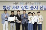 (비전21뉴스) 수원시 팔달구는 지난 9월 19일 구청 상황실에서 ‘2025년 하반기 통장자녀 장학증서 전달식’을 통해 관내 통장들의 자녀에게 장학금을 전달했다. 통장은 마을의 크고 작은 일을 주민과 함께 해결하며 행정과 지역사회를 잇는 중요한 다리 역할을 하고 있다. 팔달구는 이러한 노고에 보답하고 통장들의 사기를 북돋우기 위해 매년 상·하반기 자녀 장학금을 지원해 오고 있으며, 이번 학기에는 각 동에서 1년 이상 근무한 통장을 대상으로 4명의 대학생에게 100만원의 장학금이 지급됐다. 유계심 팔달구 통장협의회 부회장은 “통장으로서 주민과 함께하는 일이 쉽지만은 않지만, 이렇게 팔달구가 우리의 수고를 기억해주는 것만으로도 큰 힘이 된다”며 “이번 장학금이 통장들에게 자부심이 되고, 또 자녀들에게는 든든한 응원이 되기를 바란다”고 소감을 전했다. 이상균 팔달구청장은 “통장님들의 헌신이야말로 우리 구정의 든든한 뿌리”라며, “오늘 장학금이 우리 학생들의 꿈을 키우는 밑거름이 되기를 바란다”고 전했다.