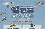 (비전21뉴스) 시흥시는 설 명절을 맞아 시민과 방문객이 뜻깊은 시간을 보낼 수 있도록 오는 2월 14일부터 18일까지 해양생태과학관에서 설 연휴 특별 행사를 운영한다. 해양생태과학관은 설날 당일인 2월 17일을 제외한 연휴 기간 정상 운영되며, 연휴 이후인 2월 19일은 휴관한다. 연휴 기간 방문객들은 해양 생태 전시 관람과 함께 명절 분위기를 느낄 수 있는 다양한 체험 프로그램을 즐길 수 있다. 특히 2월 14일부터 18일까지는 방문객 누구나 참여할 수 있는 특별 마술공연이 진행된다. 공연은 해양생태과학관 2층에서 오후 1시와 3시, 하루 2회 운영되며, 해양 전시 생물 관람과 교육 프로그램과 연계해 색다른 즐거움을 선사할 예정이다. 이와 함께 설 명절의 정취를 느낄 수 있는 전통 놀이 체험 공간도 마련된다. 해양생태과학관 3층 기획전시실에서는 윷놀이, 투호 던지기, 제기차기 등 설날을 대표하는 전통 놀이를 해양생태과학관 운영시간인 오전 10시부터 오후 6시까지 누구나 자유롭게 체험할 수 있도록 운영할 예정이다. 시 관계자는 “설날 당일을 제외한 연휴 기간 해양생태과학관을 정상 운영하며, 방문객