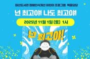 (비전21뉴스) 김포시 마산도서관은 오는 11월 1일 오후 1시부터 3시까지, 장애인식개선 어린이 프로그램 책풍당당 '넌 최고야! 나도 최고야!'을 운영한다. 이번 프로그램은 제1회 한국그림책출판협회 그림책 부문 당선작인 현단 작가의 '넌 최고야!'를 활용해 어린이들이 장애를 바라보는 기존의 편견에서 벗어나 ‘장애’가 아닌 ‘사람’을 먼저 보는 시각을 기를 수 있도록 기획됐다. 현단 작가가 진행하는 이번 강의는 주인공 ‘라이언’을 통해 장애를 가진 사람도 우리 사회의 동등한 구성원임을 자연스럽게 전달한다. 또, 자신이 생각하는 ‘최고의 사람’ 모습을 직접 그려보는 독후활동을 통해 어린이들이 사람 중심의 관점을 갖고, 다양성을 존중하는 사고를 키울 수 있도록 한다. 참여 희망자는 10월 2일 오전 10시부터 마산도서관 홈페이지 또는 현장에서 신청할 수 있다. 모집 대상은 초등학생 1학년~4학년 20명이다.