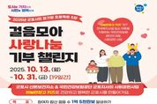 (비전21뉴스) 군포시 산본보건지소는 오는 10월 13일부터 31일까지(19일간) 국민건강보험공단 군포지사와 함께하는 '걸음모아 사랑나눔' 기부챌린지를 운영한다. ‘걸음모아 사랑나눔’ 기부챌린지는 2023년부터 군포시와 국민건강보험공단 군포지사가 협력해 추진해 온 사회공헌형 걷기 사업이다. 시민들이 일상 속에서 걸음을 모아 목표를 달성하면 이를 기부로 연계해 취약계층에 전달하는 방식으로 진행되며 시민과 지역 내 기업·단체가 함께 참여해 건강한 나눔 문화를 지역사회에 확산시키고 있다. 기부챌린지는 군포시민 누구나 참여할 수 있으며 참여 기간은 10월 13일부터 31일까지이다. 참여방법은 워크온 앱을 설치한 뒤 ‘군포시 공식 커뮤니티’에 가입해 챌린지에 참여하면 된다. 챌린지 기간 동안 누적 목표 걸음 수 1억 5천만보를 달성하면 국민건강보험공단 군포지사에서 기부하는 총 100만 원의 기부금이 관내 아동복지시설과 지역아동센터 2곳에 전달될 예정이다. 김미경 군포시 보건소장은 “이번 챌린지는 단순히 건강을 위한 걷기를 넘어 시민 한 분 한 분의 발걸음이 모여 취약계층을 돕는 소중한 나눔으로 이어진다는 데 큰 의미가