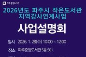 (비전21뉴스) 파주시 중앙도서관은 지역의 작가, 예술가, 독서문화 활동가 등 인재를 발굴해 작은도서관의 독서문화 프로그램을 지원하는 녪년 작은도서관 지역강사 연계사업’에 참여할 지역강사를 모집한다. ‘작은도서관 지역강사 연계사업’은 2021년부터 추진하여 시민들이 작은도서관에서 지역의 작가, 예술가, 독서문화 활동가와 만나 다양한 독서문화 활동을 체험할 수 있도록 지원해 온 인기 사업이다. 특히 2025년에는 약 1,200명의 시민이 참여해 독서문화 확산과 작은도서관 운영 활성화에 크게 기여했다. 오는 28일 10시 중앙도서관에서 참여하고자 하는 강사들을 위해 모집 전 ‘강사 사업설명회’를 개최한다. 설명회에서는 사업 취지와 신청서 작성방법 등을 설명하여, 지역 작가, 예술가, 독서문화 등 다양한 역량을 가진 강사가 참여할 수 있도록 안내할 예정이다. 2026년도 지역강사 연계사업에 참여하여 강사로 활동하고자 하는 인재들은 오는 29일부터 2월 10일까지 신청서를 작성해 제출하면 된다. 또한, 2월 26일에는 서류심사를 통과한 강사를 대상으로 박람회 형식의 프로그램 설명회인 ‘지역강사박람회’를 금