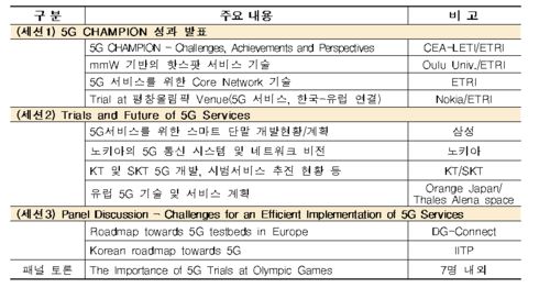 세션 1에서는 5G Champion 연구성과 발표, 세션 2에서는 삼성, 노키아 등 글로벌 기업의 5G 기술개발 현황과 전망, 세션 3에서는 유럽과 한국의 5G 정책을 공유하고, 전문가들의 이슈 토론을 진행할 예정이다.