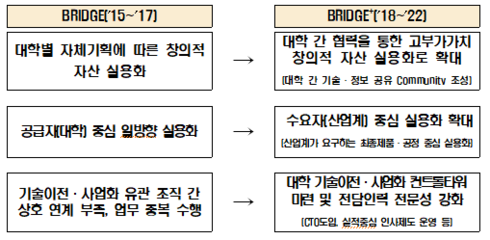 그동안 대학마다 개별적으로 추진해온 기술이전·사업화 활동을 대학 간 상호 협력을 통한 공동이전·사업화 중심으로 전환해 캠퍼스 경계를 넘는 기술 융·복합을 촉진하고, 특허에 집중된 사업 영역을 대학 구성원의 노하우·아이디어로 확대하는 등 대학 연구성과 활용도 제고에 초점을 두었다.