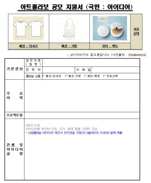 기업 분야의 경우, 자발적으로 상용 출시한 아트콜라보 제품 중 우수사례를 모집한다.