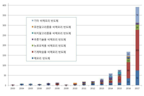 이는 ‘기계학습용 비메모리 반도체’의 경우 기계학습용 알고리즘 구동에 고성능·고용량의 반도체가 필요하기 때문이고, ‘뉴로모픽용 비메모리 반도체’의 경우에는 하드웨어적으로 사람의 뇌 신경을 모방한 차세대 AI 반도체 구조로서 최근 업계의 높은 관심과 활발한 연구 활동이 반영됐기 때문으로 풀이된다.