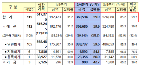 1분기까지 31.2%, 2분기까지 누적 59.9% 집행을 목표로 하며, 2018년도 정부 재정집행 목표 58.0% 보다 1.9%p 높게 설정됐다.