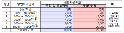 징수규정 개정안에 따르면, 주점 및 음료점업은 매장 규모에 따라 최저 월 2,000원에서 10,000원, 체련단련장은 최저 월 5,700원에서 29,800원 수준으로 저작권료를 차등 지급해야 한다.(공연보상금 별도) 다만, 50㎡ 규모 미만의 영업장은 공연사용료가 면제된다.