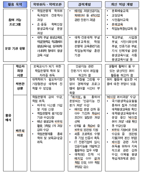 평생교육 바우처는 아래의 학력취득 교육 및 학력취득 목적 외 교육 수강에 활용 가능하다.