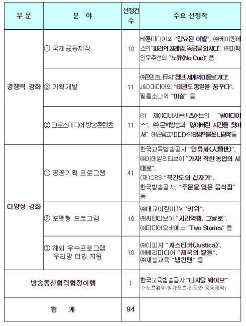 다양성강화 부문에서는공공기획 우수프로그램 41편, 포맷형 방송프로그램 10편, 우리말 더빙 10편 등 총 61편을 선정했다.